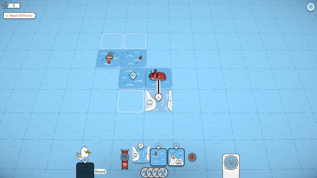 We are absolutely charmed by the art style of this game. It’s just incredibly adorable, and it’s always nice to see classic 2D art for something as simple as this. The almost monochromatic look of the tiles that use only blue, red, and white as the color scheme keeps the board from getting too visually cluttered, while the ability to zoom in and out allows a nice oversight of the playing field. We also appreciate that a lot of the unlockable customizations are purely aesthetic in nature, such as being able to change the look and color of your ship or dressing your seagull up in a silly accessory. They don’t influence the game, but they’re a nice addition.