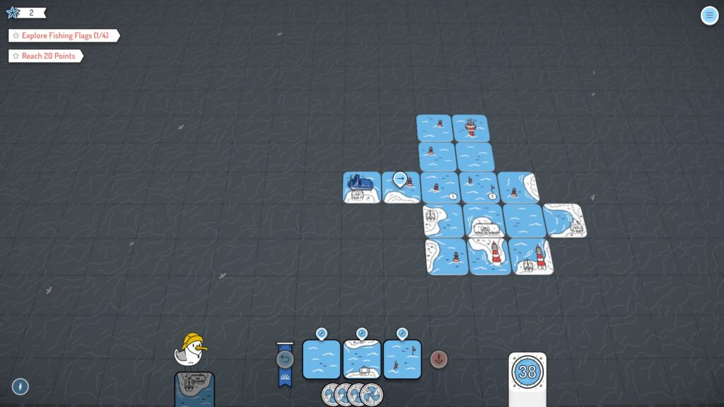 No matter what mode you’re playing, you always start the game with a singular tile in the middle of the map, the Coast Guard HQ. Four other tiles will be in your hand at the start of your turn. You must place these down on the map strategically to draw out the coastline, with your boat automatically moving to the tiles you place. Of course, the borders of the islands must make sense too, and tiles sometimes can’t be placed in certain spots. If a tile truly annoys you, you can always discard it. You’ll even get a movement token for your troubles. Movement tokens can be used each turn to move around the map across your already placed tiles.