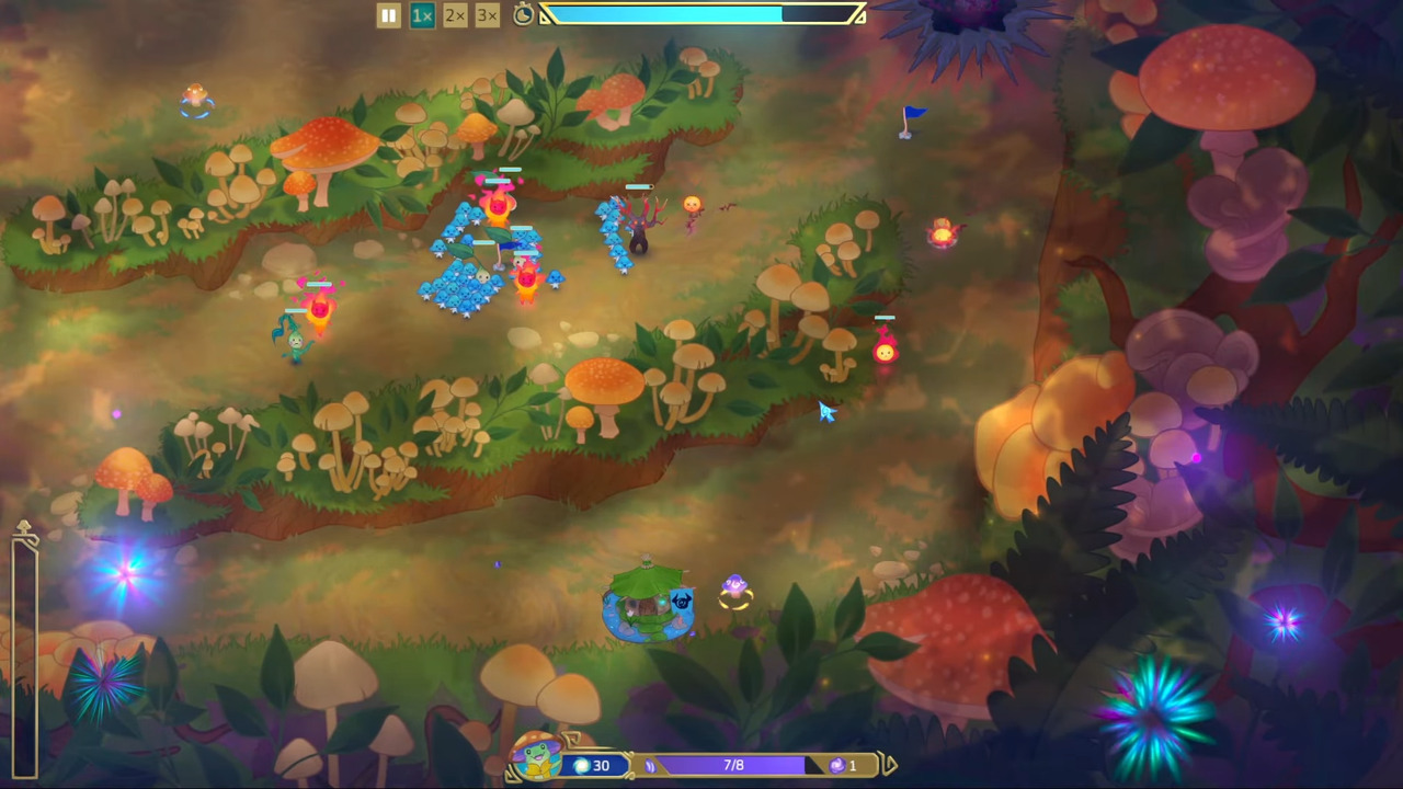At its core, Beyond the Grove is an RTS autobattler with roguelite mechanics. Battles play out automatically, with players deploying Caps before combat begins and then guiding them using small blue flags that act as rally points. You’re never directly in control of individual Caps. Instead, you’re influencing the positioning and flow of your units. Your Caps only need you to tell them where to go next, resulting in a rhythm that’s less about frantic micromanagement and more about planning, observation, and timing. Your fighting force is fairly sizable too, averaging around 100 caps per battle, although this number can be increased by spending resources called essence or by leveling up between runs. Still, it’s a good idea to keep an eye on your troop meter and adjust your strategy accordingly, because if you run out of troops, you’ll end up being overrun. Beyond the Grove avoids feeling too frantic or overwhelming through the so-called Focus Bar. Whenever this bar is full, combat automatically pauses for a while, allowing you to reassess the battlefield, reposition your rally points, or summon new units. This stop-and-go element gives you breathing room, turning a chaotic experience into something that almost becomes meditative.