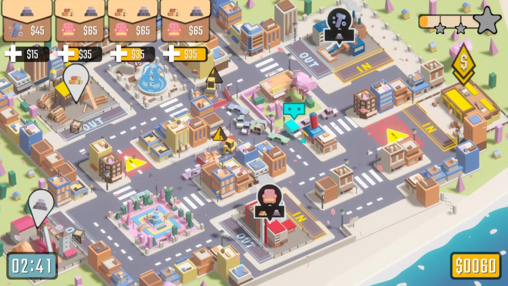 Focusing on accessibility first and foremost, CarGo!’s gameplay is straightforward and easy to grasp. The core loop involves picking up materials, refining them, and selling the finished products. Each level has a target score that must be reached to earn stars, which are required to unlock subsequent levels. The game supports up to four players in local co-op, making it well-suited for party play. Admittedly, controls take some time to get used to, but once they click, the game becomes much easier, although it still feels intentionally a bit wacky. That awkwardness seems to be part of the game’s charm rather than a flaw. There will also be obstacles barring your access to where you need to deliver or pick up supplies. Some obstacles are more realistic than silly, like opening bridges or roads closed for construction. Your vehicle can break, but you’ll simply respawn, keeping the experience forgiving. A harder difficulty mode with limited lives could have added more tension for experienced players.