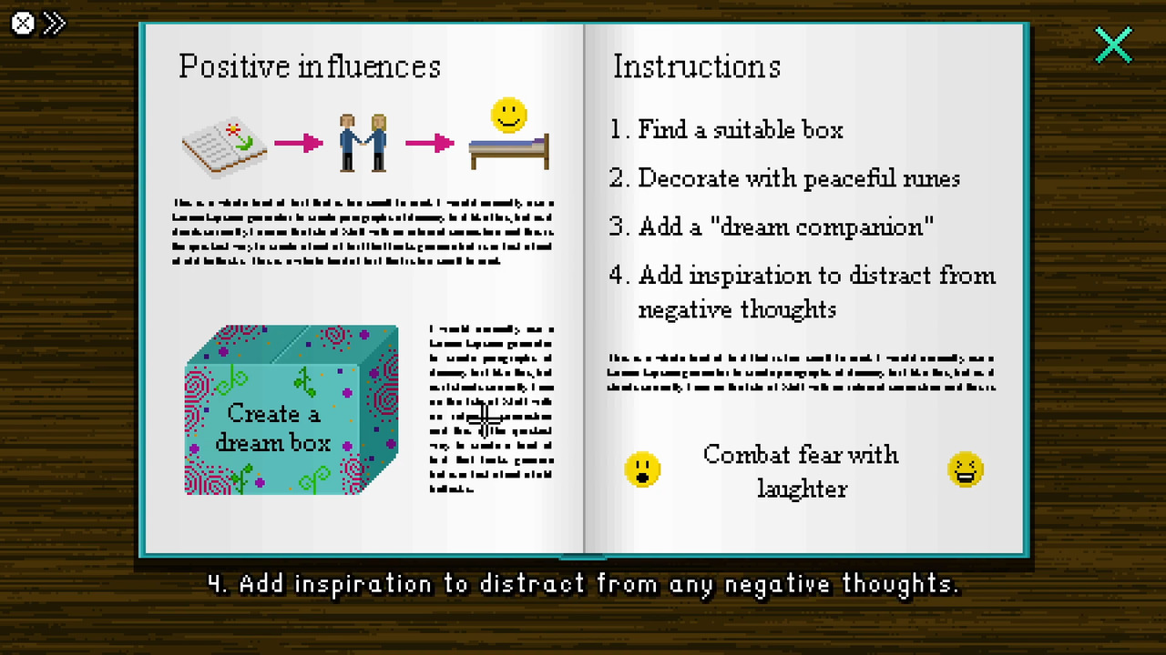 Observant readers among you have already noticed that the game’s title hints at the central theme of the story: lucid dreams. When we first meet the titular Lucy, a 13 year old girl, she’s plagued by recurring nightmares where she experiences falling endlessly through the sky. Determined to rid herself of these nightmares, Lucy decides to take control of her dreams. With the help of a psychology book her father gives her, Lucy creates a dream box, which allows her to control certain aspects of her dreams. By putting items in the box, she can enter different dream worlds. While navigating her dreams, Lucy uncovers clues that hint at a deeper mystery in her waking life: A murder occurred in the town of Figgington years ago, and Lucy believes there’s more to the story than the widely accepted explanation of a family dispute over land. Although the story isn’t afraid to take dark turns and touch upon heavy themes, things are handled in a light-hearted manner, with quirky, humorous characters and settings. The narrative is infused with the kind of British humor we’ve come to know and love in Thank Goodness You’re Here!.