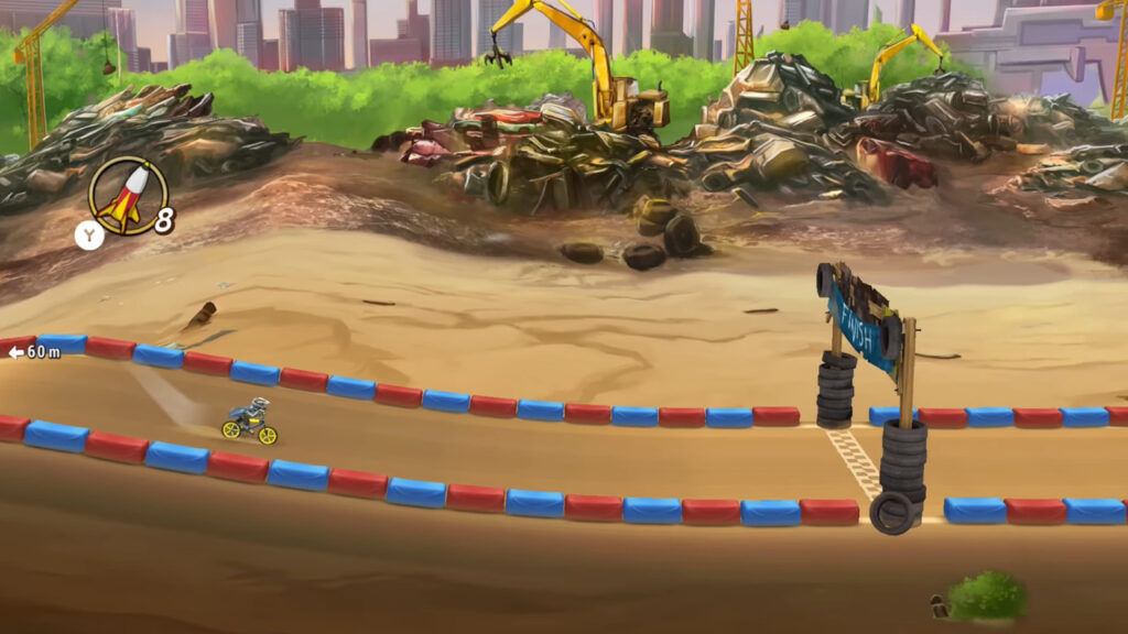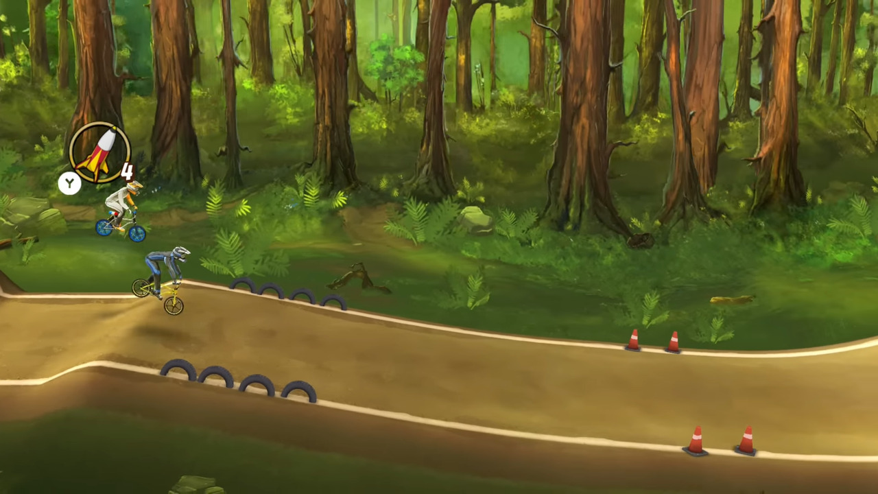 Before we get to the nitty-gritty of Mad Skills BMX 2’s gameplay, it’s important to note that we’re specifically looking at the Switch port of the game instead of the original mobile version. While the port is by and large the same game, there are some fundamental differences between both versions of the game, mainly concerning the game’s pacing and sense of progression. At the core of Mad Skills BMX 2 lies a simple 2D side-scrolling BMX racer, where you race 1v1 on tracks filled with ramps, slopes, and jumps. Momentum and physics are the heart of the gameplay. Landing smoothly and timing jumps properly is critical here, since bad landings slow you down. Races are designed for quick, pick-up-and-play sessions. Controls are intuitive and accessible. The original game was designed to be played with a touch screen, but the Switch port implements button controls instead, and these are seamlessly integrated. The controller’s shoulder buttons control jumping and momentum, and there are dedicated buttons for performing backflips or using rockets. Speaking of rockets, these act as consumable speed boosts. Although Mad Skills BMX 2 is a very accessible game, it does ramp up the difficulty, and rockets can really turn the tide in some of the game’s tougher races.