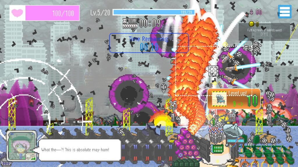 In MOCHI-O, you’ll play as the handler of MOCHI-O, a cybernetically enhanced hamster that is Earth’s last bastion of hope. It seems that the planet is constantly under attack, and the gun-wielding hamster is so powerful that an actual army is not needed anymore. As the game progresses, you’ll bond with the small weapon of mass destruction and learn more about what is actually going on. The story itself is presented similarly to a small visual novel, and while the overall plot never really goes that deep, we quite enjoyed the storyline.