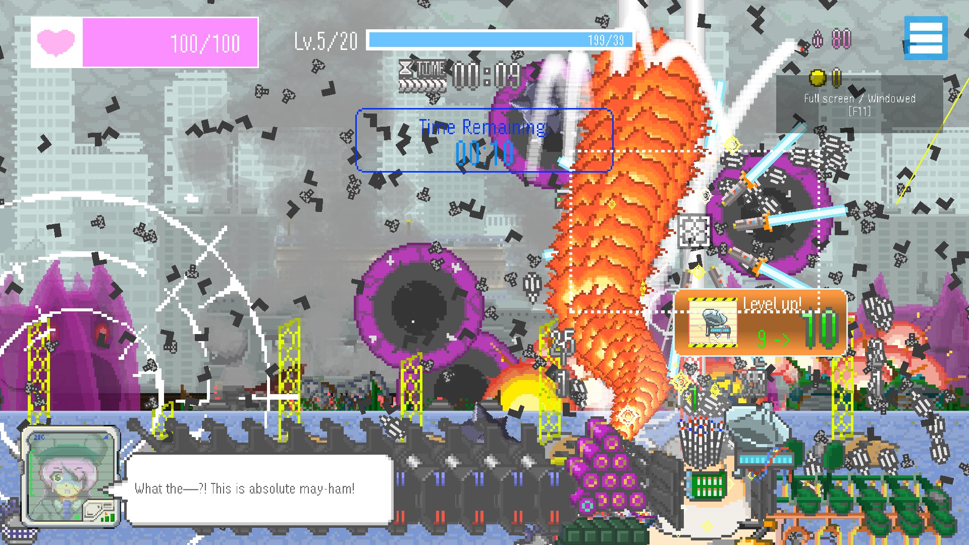 MOCHI-O is an original spin on the tower defense formula, where you will play through short levels, upgrading a cybernetically enhanced hamster that is the only force capable of saving the world. It’s an interesting concept, and it’s also very straightforward. Instead of building structures, you’ll actually just point your cursor in the general direction of the oncoming enemies and then fire your weapons automatically. After killing enemies, they will drop gems, which you can pick up to gain experience to level up. Upon leveling up, you’ll get three options to choose from, which is very similar to a lot of roguelike titles. In these options, you’ll find passive upgrades but also new weapons, which will wreak even more havoc on screen.
