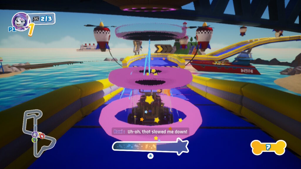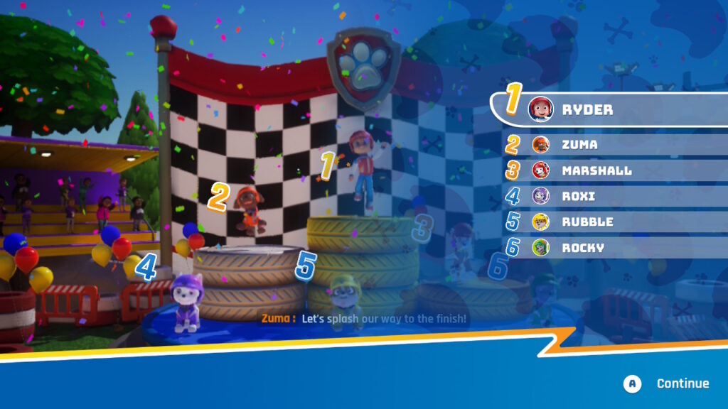 Keeping things simple, Rescue Wheels: Championship’s story sees the puppies of the titular Paw Patrol -Chase, Skye, Marshall, Rubble, Zuma, Rocky, and Roxi- participate in a racing championship around Adventure Bay. However, the nefarious Boomer & Frank and evil mayor Humdinger are in the championship as well, and if they win, this spells doom for our puppy friends. We don’t doubt that there is some deep political commentary in play here, having the mayor be evil, but you’d imagine that he’d find other ways to deal with dogs that work as police officers or firemen. Wouldn’t he be their boss? Maybe we need to watch the actual show to understand the deeper meaning, as there isn’t a whole lot of exposition in the game.