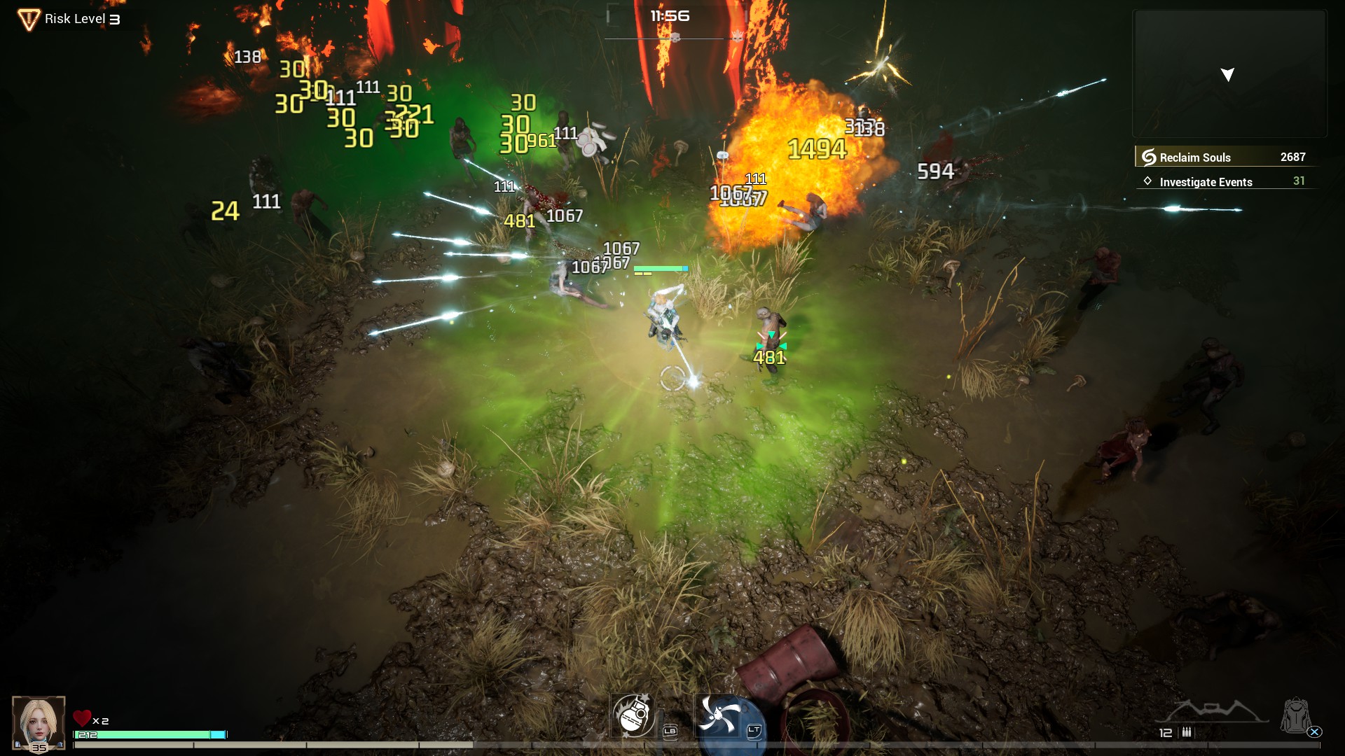 The core gameplay loop is very similar to other Survivors-like games, as you pick a stage, a difficulty level, and a character, and you run around trying to survive and kill enemies for the duration of said level. R.I.P. offers the option to main manually or to perform your attack automatically. Some attacks will remain manual, as these are skills you need to activate and aim yourself. As you kill more enemies, you gain more experience, which levels you up. Upon leveling up, a level-up cache is shot down from space, which you need to pick up. In these caches, there will always be three options to choose from, with additional options if you choose to reroll. It’s all fairly standard fare for the genre. The twist here, however, is the loot that you can pick up. Enemies will drop gear, and you can equip this, making your chosen character stronger in the process. You can also store gear in your stash in the base, allowing other characters to equip items as well. This can already provide a nice boost to characters you hardly play or still need to level up. The higher ‘risk’ level you clear stages, the higher the tier of gear that will drop. It’s an engaging and satisfying gameplay loop.