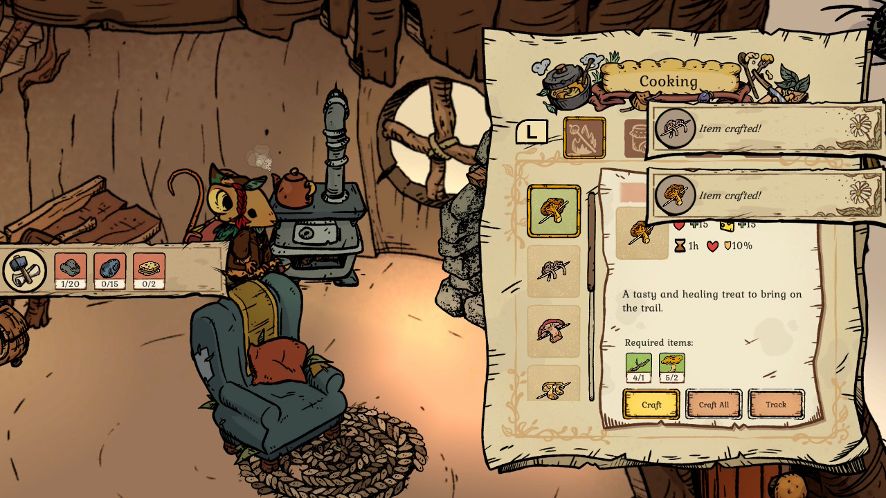 By combining its core gameplay with farming sim elements, Winter Burrow makes for a surprisingly cozy take on the survival game genre. The core loop is familiar from the get-go: you find yourself in a derelict version of your parents’ old burrow, and with the coldness of winter creeping up on you, you need to get into action. Your first order of business is to get a fire going, and next is a place to sleep. That means going outside to gather resources, with which you can repair the broken furnishings of your home, as well as make new ones. The core gameplay loop revolves around you venturing into the wilderness, seeking out materials and using these to craft things. There is a constant sense of progress, as you unlock new crafting recipes, including ones you can find hidden in the wild, with the game gently nudging you in the right direction but still giving you ample freedom when it comes to deciding how you fill in “surviving”.